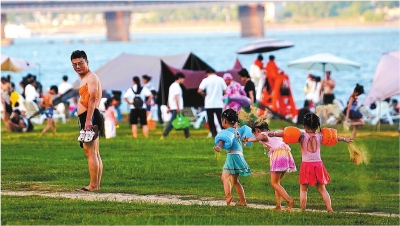 近日高温,游人在南昌红谷滩区摩天湾天然泳场游玩。