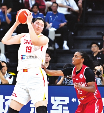 中国女篮球员张子宇(左)在比赛中。