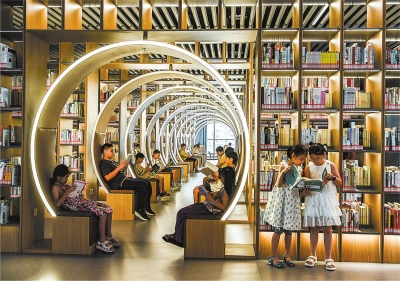 近日,学生在金华市图书馆“时光隧道”长廊书架阅读图书。