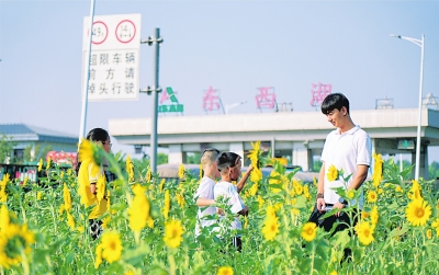 东西湖收费站旁边是向日葵花海,吸引市民前来游玩。