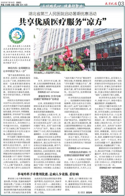 日前,湖北省第三人民医院正式启动暑期医疗惠民系列活动,组织医院硚口院区、阳逻院区20余个临床重点科室,为市民提供多项减免优惠健康服务,让群众在炎炎夏日里共享优质医疗服务“凉方”。