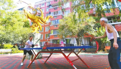 微改造后的老旧小区内,邻居们相约清晨来一场乒乓球赛。