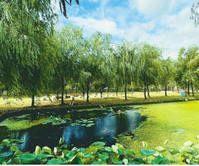 岱黄高速程家墩驿站是一座“公园式高速驿站”,有岸边垂柳、小湖荷花等风景。