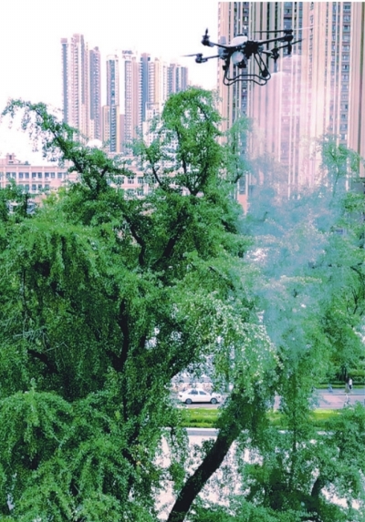 于是,汉阳区公园管理中心添置了一台农用植保无人机,从上往下喷水,弥补喷雾系统的不足。无人机还具有喷施叶面肥、喷洒农药防治病虫害等功能。