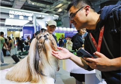 参观者与一家宠物毛发护理品展商的模特犬互动。