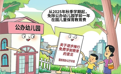 国务院办公厅印发《关于逐步推行免费学前教育的意见》,5日对外公布。意见明确,从2025年秋季学期起,免除公办幼儿园学前一年在园儿童保育教育费。