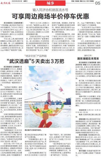 “这款透扇自7月28日在武汉市各个景区铺开销售以来,前5天就卖出了3万把。”扇子设计者、三色鸟创意团队负责人史召表示,“这是我们为武汉的夏天专门设计的一款文创。”