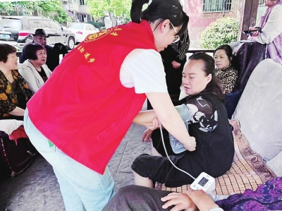 社区干事到居民身边量血压。