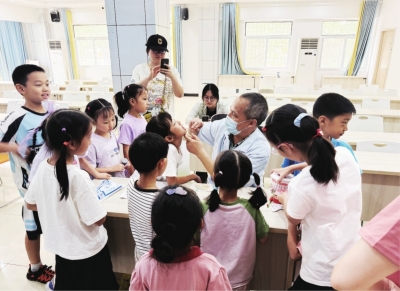 牙医为孩子们检查口腔。