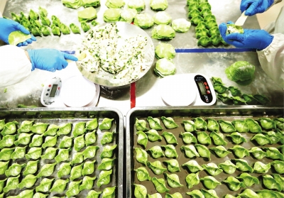山东省青岛岛尚食品有限公司的工人在包饺子。(资料照片)