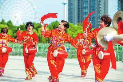 江苏南通通州区的舞蹈爱好者在南山湖公园打腰鼓。