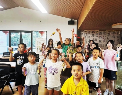 志愿者和小朋友们在膏药铺湾学习做中药香囊。