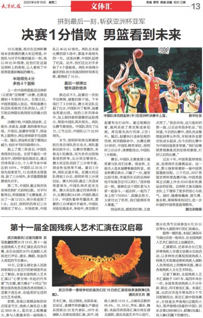 记者了解到,全国残疾人艺术汇演始于1987年,每四年举办一次,全国各类别残疾人不分年龄、职业,均可参加汇演。本届汇演,由武汉市选手带来的5个节目脱颖而出,将在汇演中现场展示,分别是女声独唱《边境的小鸟》、男声独唱《我爱你中国》、民乐合奏《浣纱映日》、群舞《凤凰》、双人舞《羽翼下的晴空》。