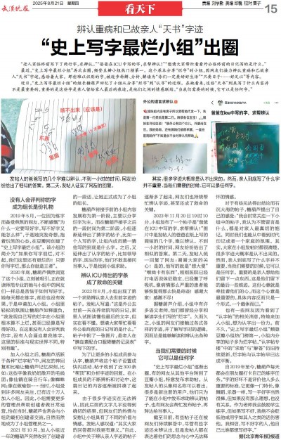 近日,“史上写字最烂小组”的组长糖葫芦回忆了小组从分享“烂字”到“认字”的过程。在她看来,这些“天书”到底写了什么内容并不是最重要的,重要的是这些字是亲人留给家人最后的痕迹,是他们之间的情感联结。“当我们需要的时候,它可以是任何字。”