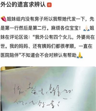 “老人家临终前写下了两行字,求辨认。”“爸爸在ICU中写的字,求帮辨认!”“想请大家帮忙看看外公临终前的日记写的是什么。”