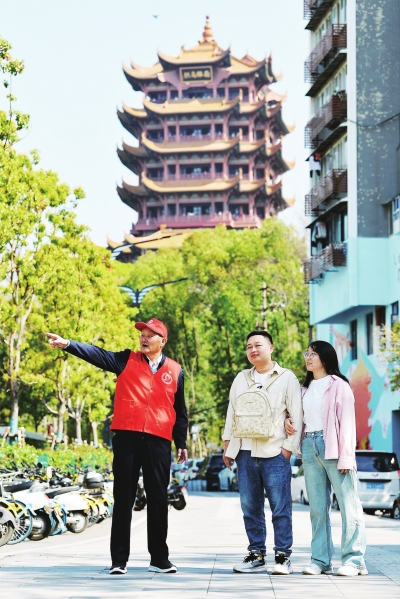 地铁站旁,身着红马甲的社区志愿者在黄鹤楼下为游客们指路。