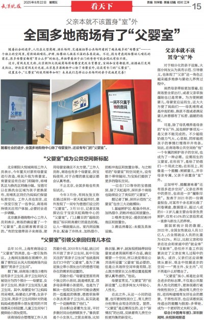 “父婴室”虽小,却是社会观念进步的标志牌,不仅是公共服务人性化的提升,更体现着打破传统性别分工、推动育儿责任分担,进而构建婚育友好社会的愿景。于男性而言,也应该看到其传递出的提醒与鼓励:多带娃,成为一个更好的丈夫和父亲。