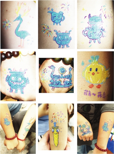 用笔在皮肤上勾勒出轮廓,再给主体填上黄色,画上一对灵动的大眼睛,一把卡通版“越王勾践剑”被团队成员张登月画在一位外地来汉旅游的小朋友的手臂上。