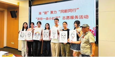 老党员兰旭家(右一)给大学生志愿者画漫画肖像。