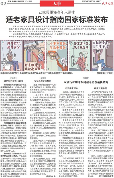 记者8月25日从市场监管总局获悉,市场监管总局(国家标准委)近日批准发布《适老家具设计指南》国家标准,将于2026年2月1日起正式实施。这一标准立足老年人的实际需求与生理心理特点,从适老家具的外观材料、智能化、功能配置等方面提出细化设计要求,旨在提升家具产品与老年人需求的适配度。