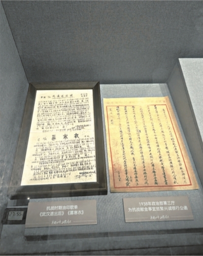 展柜内陈列抗战时期油印歌单、公函等文物。