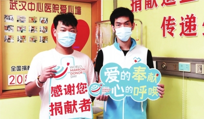 焦子怡(左)和周奇(右)分别成为湖北省第742、743例非血缘造血干细胞捐献者。
