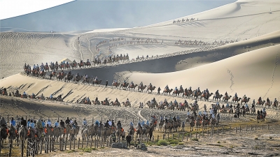 游客在甘肃省敦煌市鸣沙山月牙泉景区游览。