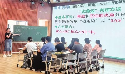 “证明三角形全等,至少需要几个条件?”8月27日上午9时许,一堂八年级数学课在该校报告厅开课,讲课的是八年级数学备课组长,听课的则是9位数学老师。整节课分为课前导学、知识讲解、小组讨论、课堂练习等不同部分,尽可能模拟真实课堂场景和流程,听课老师要举手回答问题,也要上台尝试作图;有时出现错误或不准确的回答,其他听课老师会举手纠正。