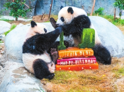 8月15日,香港海洋公园为首对“港产”龙凤胎大熊猫“加加”(右)“得得”庆祝一岁生日。
