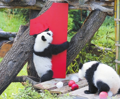 8月22日,在德国柏林动物园的大熊猫“梦好”(左)和“梦甜”过一岁生日。