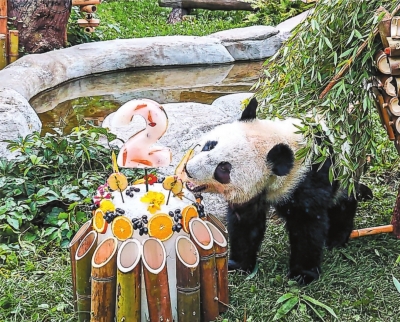8月24日,大熊猫“喀秋莎”在莫斯科动物园享用两岁“生日蛋糕”。