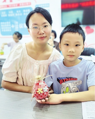 活动开始,志愿者向孩子们讲解了教师节的由来,传达了尊师重教的意义。在接下来的手工环节中,孩子们发挥想象力进行花瓶DIY,清洁瓶身、上胶、贴上琉璃片、填缝……一个个五颜六色的马赛克花瓶创作出来。家住金湖家园小区的谭景睿小朋友开心地说:“我要把亲手制作的花瓶送给老师,祝她节日快乐!”