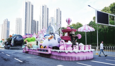“动漫萌宠”花车在晴川大道上巡游。