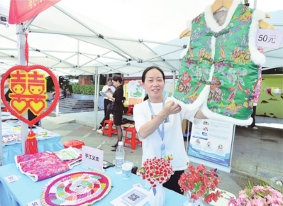 湖北九州德康养老现场义卖残疾人朋友手工制作的小棉袄。