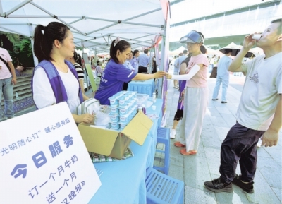 光明随心订工作人员向居民赠饮鲜奶制品。