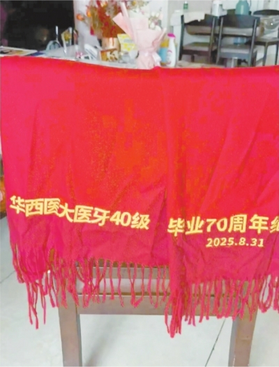钱幼琼拿出这场同学会的留念——一条印有“华西医大医牙40级毕业70周年纪念”的红色围巾、一朵写着名字年龄的胸花、一个玻璃的纪念品、一本晚辈作的诗歌集、一张校友会敬赠的诗歌卡片。