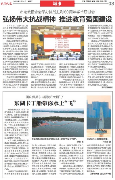再抬头往天上望,亿航无人驾驶载人飞行器已完成试飞,将于国庆假期前开展试运营。位于东湖岸边的听涛景区网红躺椅区也悄然发生着变化,这里即将在国庆假期举办“东湖时光能量派对”,为游客打造一处看湖景、喝下午茶的松弛场景。湖北省博物馆推出“夜游博物馆”全新产品,常设展览全部开放,编钟演出加演夜场。“东湖之眼”为国庆节打造全新环形摩天轮高清荧幕,以“文化+夜游”消费新场景为网红景区“东湖之眼”再造新爆点。