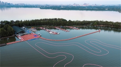 湖面白帆点点,临湖“热浪”滚滚,9月23日,东湖水面一片热闹。记者在东湖帆船基地看到,临帆船港口的水上卡丁船赛道已建好,从天空俯瞰,宛如水面绘就的时尚线条涂鸦。工作人员正调试蓝色卡丁船,穿好救生衣后,一场速度与激情的试赛随即展开。据介绍,中秋国庆临近,东湖风景区正蓄力系列“大招”优化文旅产业,迎接海内外游客。