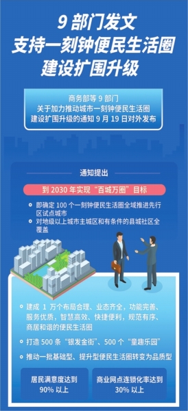 通知提出,到2030年实现“百城万圈”目标,即确定100个一刻钟便民生活圈全域推进先行区试点城市,对地级以上城市主城区和有条件的县城社区全覆盖;