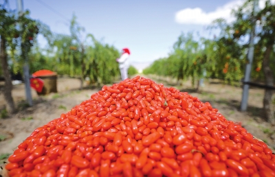 采摘工在百瑞源殷红子熟枸杞庄园采摘头茬枸杞。