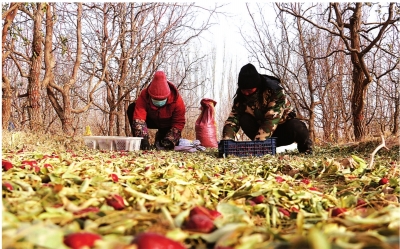 敦煌市郭家堡镇土塔村农民在枣园中收获红枣。
