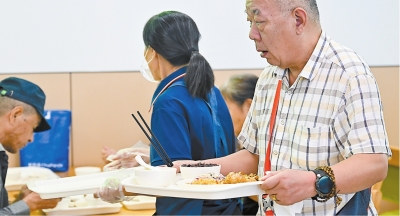 近日,老年居民准备在社区食堂用餐。