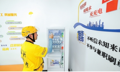 近日,外卖骑手在嘉兴南湖区的24小时工会驿站(嘉工驿站工商银行站)的冰箱内取用免费的矿泉水。