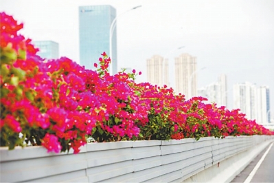 武汉街头还选用了不少矮株型三角梅营造花带。驱车行驶在江岸区金桥大道,武昌区东湖路、沙湖大桥,市民可以看到,中分带盛开的三角梅宛如一条玫红色飘带,令人赏心悦目。