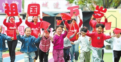 国庆、中秋“双节”将至,山东省临沂市郯城县郯城街道官塘幼儿园的老师和孩子进行课间“快乐跑”。
