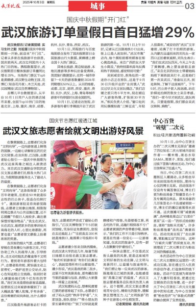 在黎黄陂路上,志愿者们化身“文明向导”,一边向游客递上鲜艳的国旗,一边耐心讲解街区的历史文化背景;在吉庆街、江汉路,志愿者贴心指引……国庆中秋假期为武汉这座英雄之城注入滚烫活力。来自武汉交通职业学院的武汉文旅志愿者们扎根各大热门点位,为假期旅游服务注入了最动人的温度。