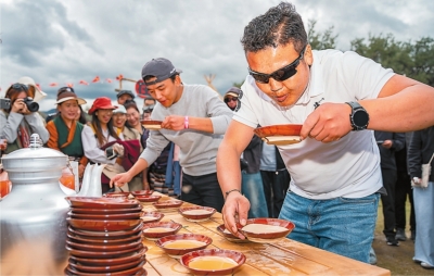在山南市琼结县强吉村第二届林卡大会现场,当地群众在喝青稞酒(9月13日摄)。“林卡”在藏语中意为“园林”,“过林卡”即郊游、野餐,是藏族群众的传统休闲方式。“过林卡”已成为西藏旅游一张闪亮的新名片和人们充满活力的生活方式。