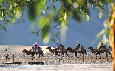 10月1日,游客在甘肃省敦煌市鸣沙山月牙泉景区游览。