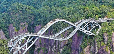 10月1日,游客在浙江省台州市仙居县神仙居景区如意桥上游览。
