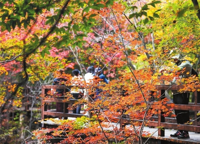 这是10月1日拍摄的辽宁本溪老边沟风景区的景色。国庆假期,辽宁本溪老边沟风景区内的枫叶五彩斑斓,进入观赏期,吸引游客观景游玩。